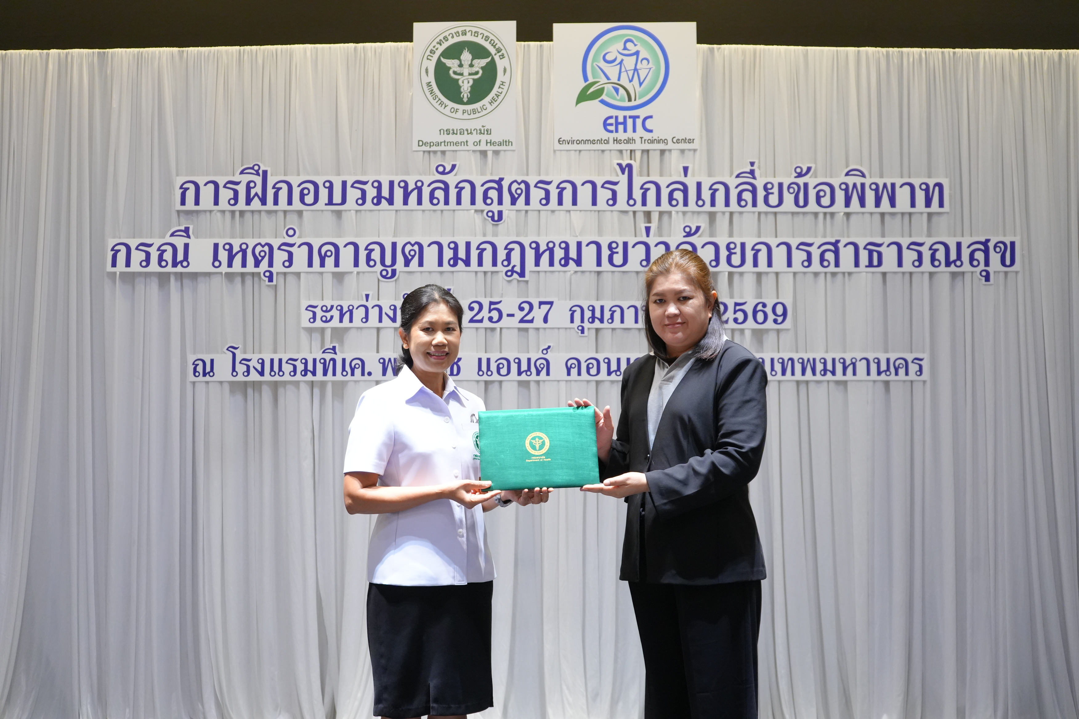 นที่ 27 กุมภาพันธ์ 2569 สำนักอนามัยสิ่งแวดล้อมโดยศูนย์ฝึกอบรมด้านอนามัยสิ่งแวดล้อม (EHTC) มอบประกาศนียบัตรผู้ผ่านการอบรมหลักสูตรการไกล่เกลี่ยข้อพิพาท เหตุรำคาญตามกฎหมายว่าด้วยการสาธารณสุข ณ โรงแรมทีเค พาเลซ แอนด์ คอนเวนชั่น กรุงเทพมหานคร