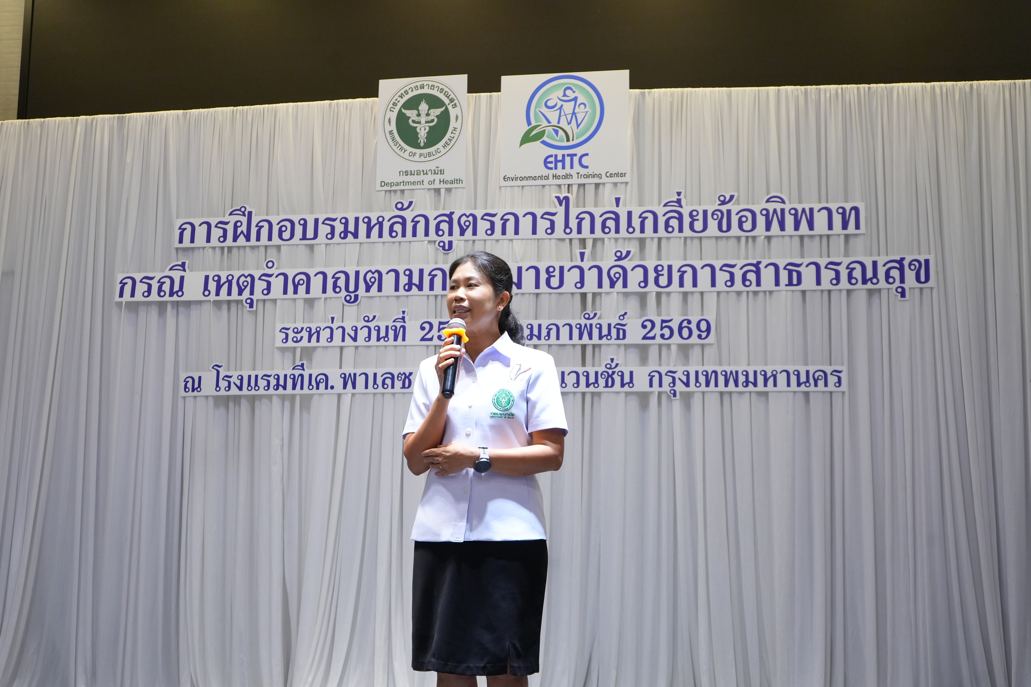 วันที่ 27 กุมภาพันธ์ 69 นางณีรนุช อาภาจรัส ผู้อำนวยการสำนักอนามัยสิ่งแวดล้อม เป็นประธานมอบใบประกาศนียบัตร และพิธีปิดการอบรมพัฒนาขีดความสามารถบุคลากรด้านอนามัยสิ่งแวดล้อม ประจำปีงบประมาณ พ.ศ. 2569 หลักสูตรการไกล่เกลี่ยข้อพิพาท เหตุรำคาญตามกฎหมายว่าด้วยการสาธารณสุข จัดโดยศูนย์ฝึกอบรมด้านอนามัยสิ่งแวดล้อม (Environmental Health Training Center : EHTC) ระหว่างวันที่ 25 – 27 กุมภาพันธ์ 2569 ณ โรงแรมทีเค พาเลซ แอนด์ คอนเวนชั่น กรุงเทพมหานคร มีวัตถุประสงค์เพื่อสร้างความรู้ความเข้าใจเกี่ยวกับการไกล่เกลี่ยข้อพิพาท สร้างความรู้ด้านกฎหมาย เทคนิคการวิเคราะห์ความขัดแย้ง และทักษะจากการฝึกปฏิบัติกรณีศึกษา ไปประยุกต์ใช้ในการไกล่เกลี่ยและแก้ไขปัญหาในพื้นที่ได้อย่างถูกต้องตามหลักวิชาการและกฎหมาย ผู้ผ่านการอบรมฯ ครั้งนี้ ประกอบด้วย ผู้บริหาร นักวิชาการ นิติกรจากองค์กรปกครองส่วนท้องถิ่น สำนักงานสาธารณสุขจังหวัด โรงพยาบาล และมหาวิทยาลัย จำนวนทั้งสิ้น 85 คน