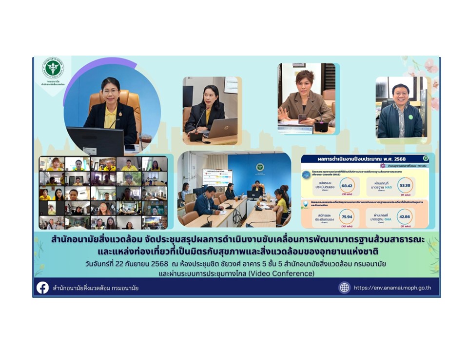 วันที่ 22 กันยายน 2568 สำนักอนามัยสิ่งแวดล้อม จัดประชุมสรุปผลการดำเนินงานขับเคลื่อนการพัฒนามาตรฐานส้วมสาธารณะและแหล่งท่องเที่ยวที่เป็นมิตรกับสุขภาพและสิ่งแวดล้อมของอุทยานแห่งชาติ ณ ห้องประชุมชิต ชัยวงศ์ สำนักอนามัยสิ่งแวดล้อม กรมอนามัย และผ่านระบบการประชุมทางไกล (Video Conference) โดยนางณีรนุช อาภาจรัส ผู้อำนวยการสำนักอนามัยสิ่งแวดล้อม เป็นประธานการประชุม ผู้เข้าร่วมประชุม ประกอบด้วย เจ้าหน้าที่สำนักอนามัยสิ่งแวดล้อม สำนักอุทยานแห่งชาติ สำนักบริหารพื้นที่อนุรักษ์ที่ 1-16 อุทยานแห่งชาติ และศูนย์อนามัยที่ 1-12 รวมจำนวนทั้งสิ้น 150 คน วัตถุประสงค์การประชุมเพื่อนำเสนอข้อมูลผลการดำเนินงานและทบทวนค่าเป้าหมายรายปีของแผนปฏิบัติการพัฒนามาตรฐานส้วมสาธารณะและแหล่งท่องเที่ยวที่เป็นมิตรกับสุขภาพและสิ่งแวดล้อมของอุทยานแห่งชาติ ระยะ 5 ปี (พ.ศ. 2568 – 2572) ภายใต้บันทึกความเข้าใจว่าด้วยความร่วมมือในการพัฒนามาตรฐานส้วมสาธารณะและแหล่งท่องเที่ยวที่เป็นมิตรกับสุขภาพและสิ่งแวดล้อม ระหว่างกรมอนามัย และ กรมอุทยานแห่งชาติ สัตว์ป่า และพันธุ์พืช