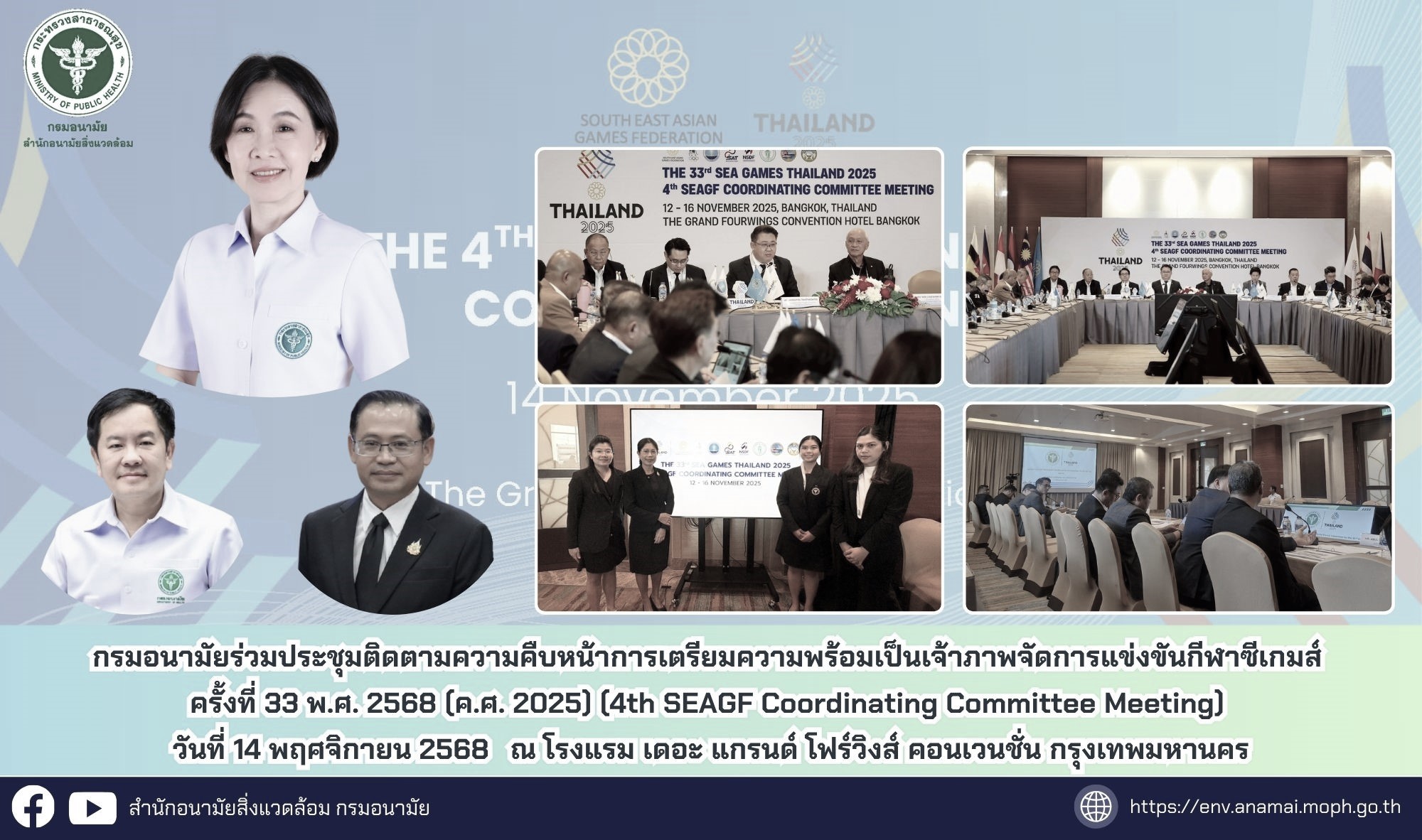 วันที่ 14 พฤศจิกายน 2568 กรมการแพทย์และกรมอนามัย ในฐานะรองประธานและกรรมการคณะกรรมการฝ่ายสนับสนุนและบริการ สาขาแพทย์และสุขอนามัย เข้าร่วมการประชุมติดตามความคืบหน้าการเตรียมความพร้อมเป็นเจ้าภาพจัดการแข่งขันกีฬาซีเกมส์ ครั้งที่ 33 พ.ศ. 2568 (ค.ศ. 2025) (4th SEAGF Coordinating Committee Meeting) ณ โรงแรม เดอะ แกรนด์ โฟร์วิงส์ คอนเวนชั่น กรุงเทพมหานคร เพื่อนำเสนอความก้าวหน้าการเตรียมความพร้อมเป็นเจ้าภาพจัดการแข่งขันกีฬาซีเกมส์ ครั้งที่ 33 พ.ศ.2568 (4th SEAGF Coordinating Committee Meeting) โดยที่ประชุมติดตามความก้าวหน้าการดำเนินงานการเตรียมความพร้อมด้านการแพทย์และสุขอนามัย และประเด็นอื่น ๆ ดังนี้ 1) การเตรียมความพร้อมของสนามราชมังคลากีฬาสถาน ซึ่งเป็นสถานที่จัดพิธีเปิดการแข่งขัน 2) การประชาสัมพันธ์การจัดการแข่งขัน 3) การจัดบริการที่พัก อาหารและรถรับส่ง 4) การเตรียมการด้านความปลอดภัย 5) การถ่ายทอดสัญญาณการแข่งขัน ทั้งนี้ ที่ประชุมได้เน้นย้ำถึงการเตรียมการทีมแพทย์ฉุกเฉินในช่วงของการจัดการแข่งขัน โดยมอบหมายให้คณะกรรมการสาขาการแพทย์และสุขอนามัยดำเนินการ เพื่อให้ประเทศไทยมีความพร้อมในการเป็นเจ้าภาพจัดการแข่งขันกีฬาฯ ดังกล่าว