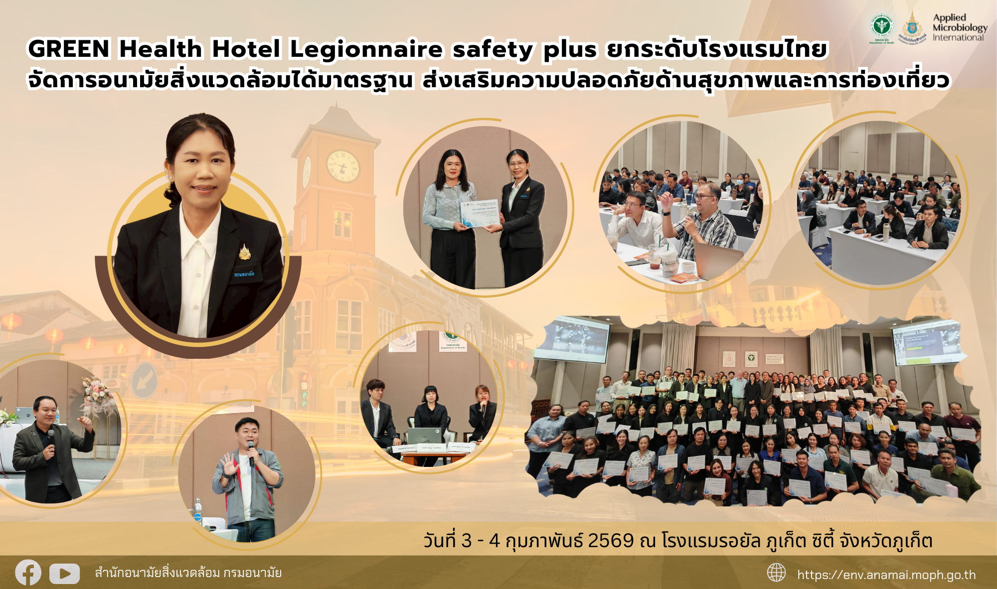 วันที่ 4 กุมภาพันธ์ 2569 ที่โรงแรมรอยัล ภูเก็ต ซิตี้ จังหวัดภูเก็ต นางณีรนุช อาภาจรัส ผู้อำนวยการสำนักอนามัยสิ่งแวดล้อม เป็นประธานเปิดการประชุม และมอบเกียรติบัตรให้กับโรงแรมและเจ้าหน้าที่ที่เข้าร่วมประชุมเชิงปฏิบัติการพัฒนาและขับเคลื่อนมาตรฐาน GREEN Health Hotel Legionnaire safety plus ระหว่างวันที่ 3 – 4 กุมภาพันธ์ 2569