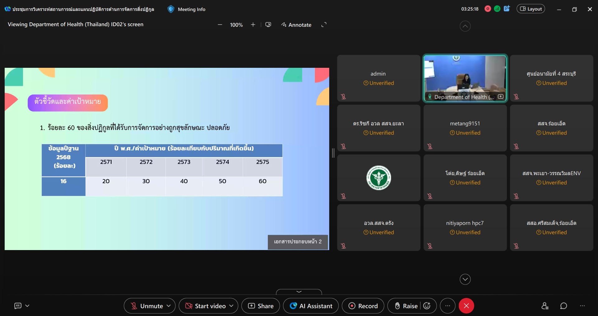 วันที่ 13 มีนาคม 2569 นางณีรนุช อาภาจรัส ผู้อำนวยการสำนักอนามัยสิ่งแวดล้อม เป็นประธานการประชุมจัดทำสถานการณ์การจัดการสิ่งปฏิกูลและรับฟังความคิดเห็นต่อ (ร่าง) แผนปฏิบัติการด้านการจัดการสิ่งปฏิกูลของประเทศ ระยะที่ 1 (พ.ศ. 2570 – 2575) ณ ห้องประชุม ชิต ชัยวงศ์ สำนักอนามัยสิ่งแวดล้อม กรมอนามัย และผ่านระบบประชุมทางไกล (Video Conference) ผู้เข้าร่วมประชุมประกอบด้วย ผู้แทนศูนย์อนามัยที่ 1-12 สถาบันพัฒนาสุขภาวะเขตเมือง สำนักงานสาธารณสุขจังหวัด ผู้แทนสำนักงานสาธารณสุขอำเภอ ผู้แทนโรงพยาบาลทุกระดับ และผู้แทนองค์กรปกครองส่วนท้องถิ่น รวม 250 คน